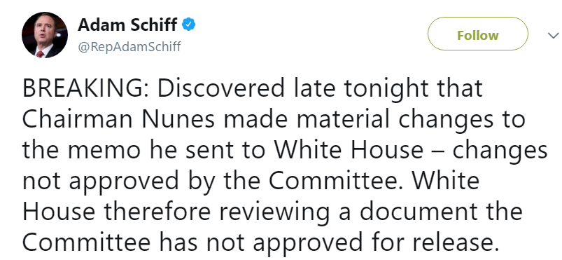 Schiff emphasizes that only he and Rep. Trey Gowdy have seen the underlying intelligence on which the Nunes memo is based (only members of the Gang of Eight have access to the intelligence, but Gowdy viewed the intelligence for the majority).